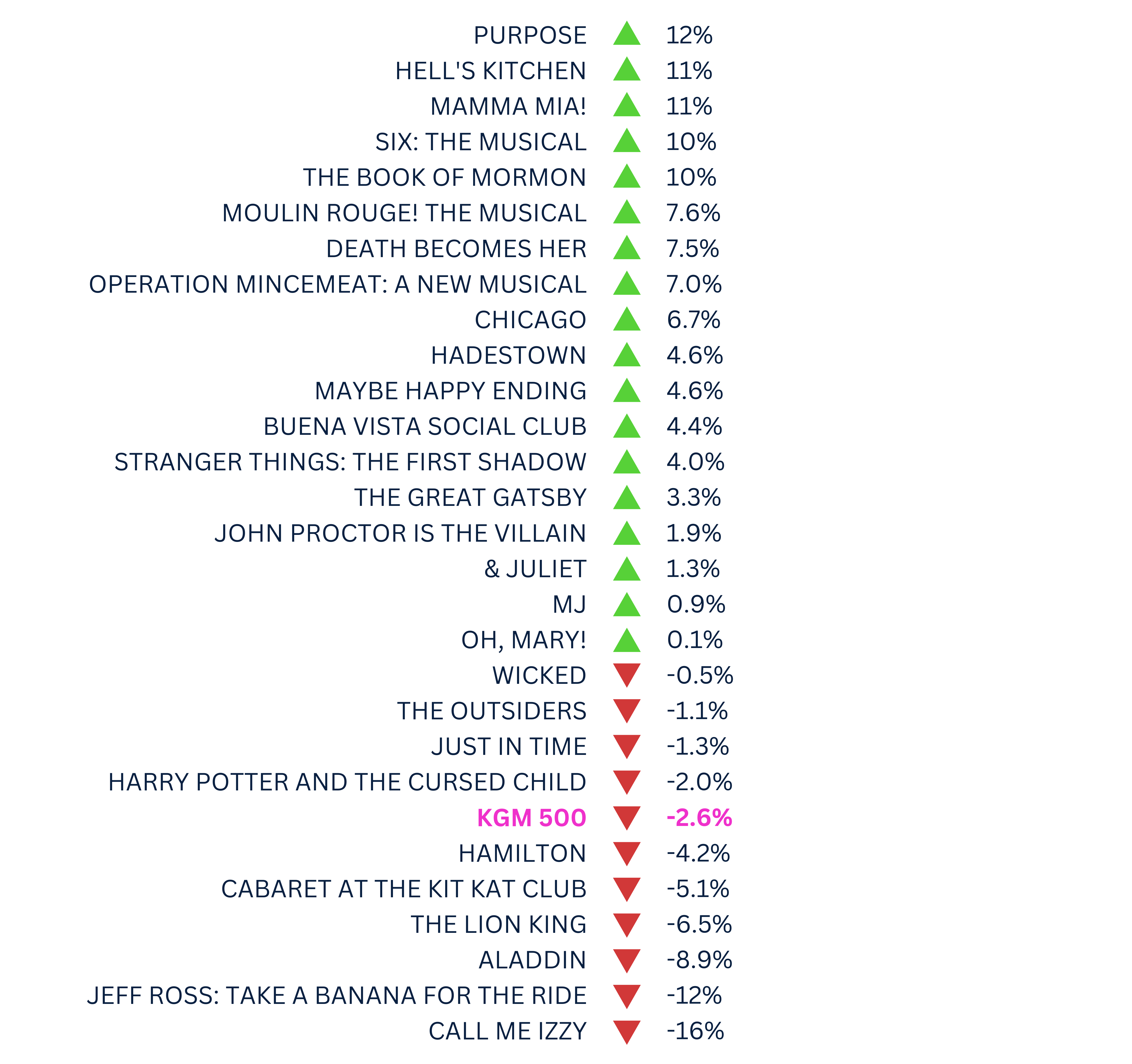 The KGM 500 is a Broadway market index used to track the overall health of the market based on the grosses of 5 long-running shows. This week, the KGM 500 dipped to $6,877,461, a 2.6% decrease from the previous week. While the end of the summer is a traditionally slow time for Broadway, attendance is still up 6.4% compared to this same week last season. Below, you’ll find a metric to track each show’s performance in relation to the benchmark of the KGM 500.