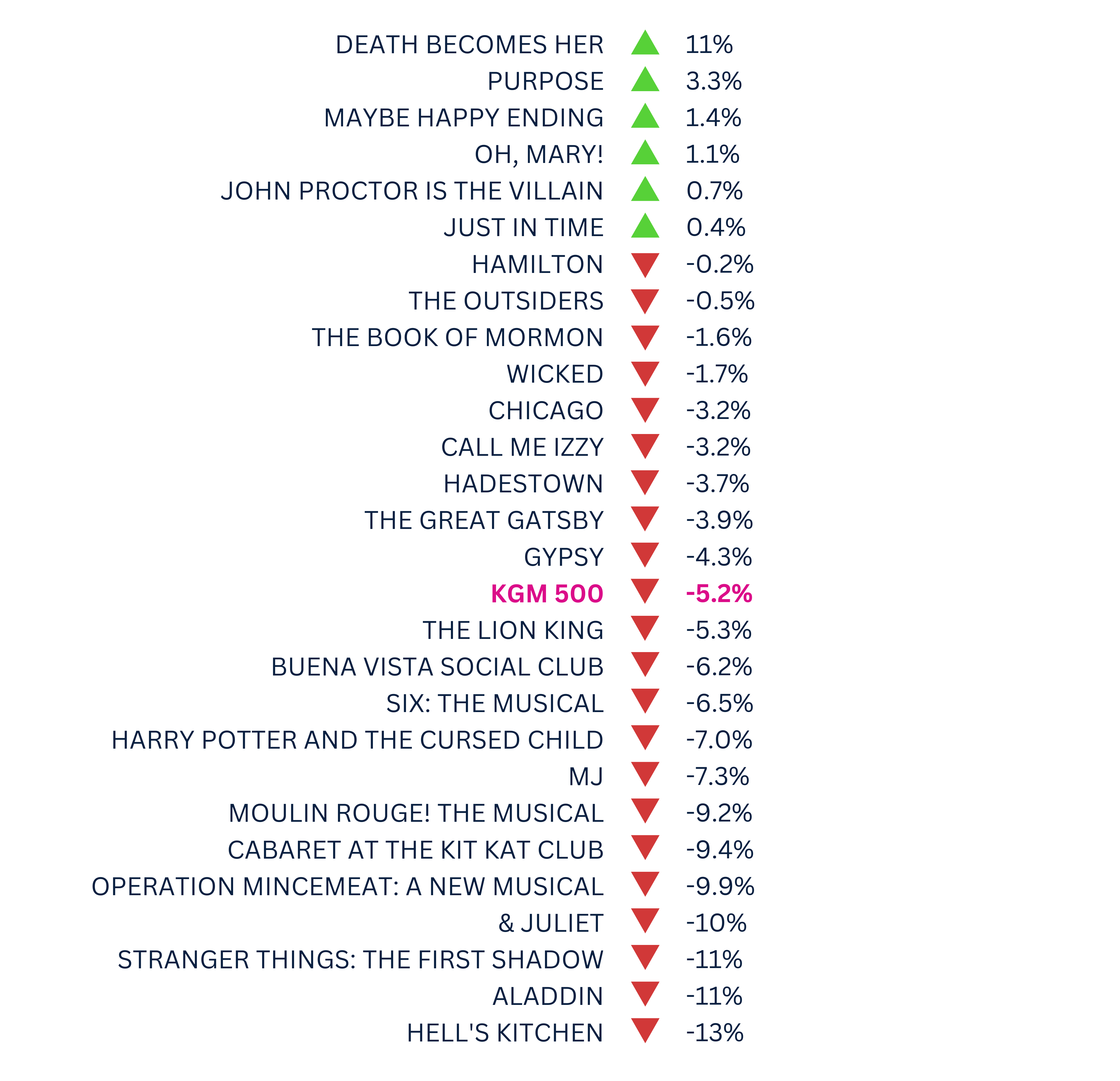 The KGM 500 is a Broadway market index used to track the overall health of the market based on the grosses of 5 long-running shows. This week, the KGM 500 dipped to $7,700,709, a 5.2% decrease from the previous week. In a particularly slow week for Broadway, both grosses and overall attendance fell as many New Yorkers are escaping the city, and industry folk head to Edinburgh for the Fringe. Below, you’ll find a metric to track each show’s performance in relation to the benchmark of the KGM 500.