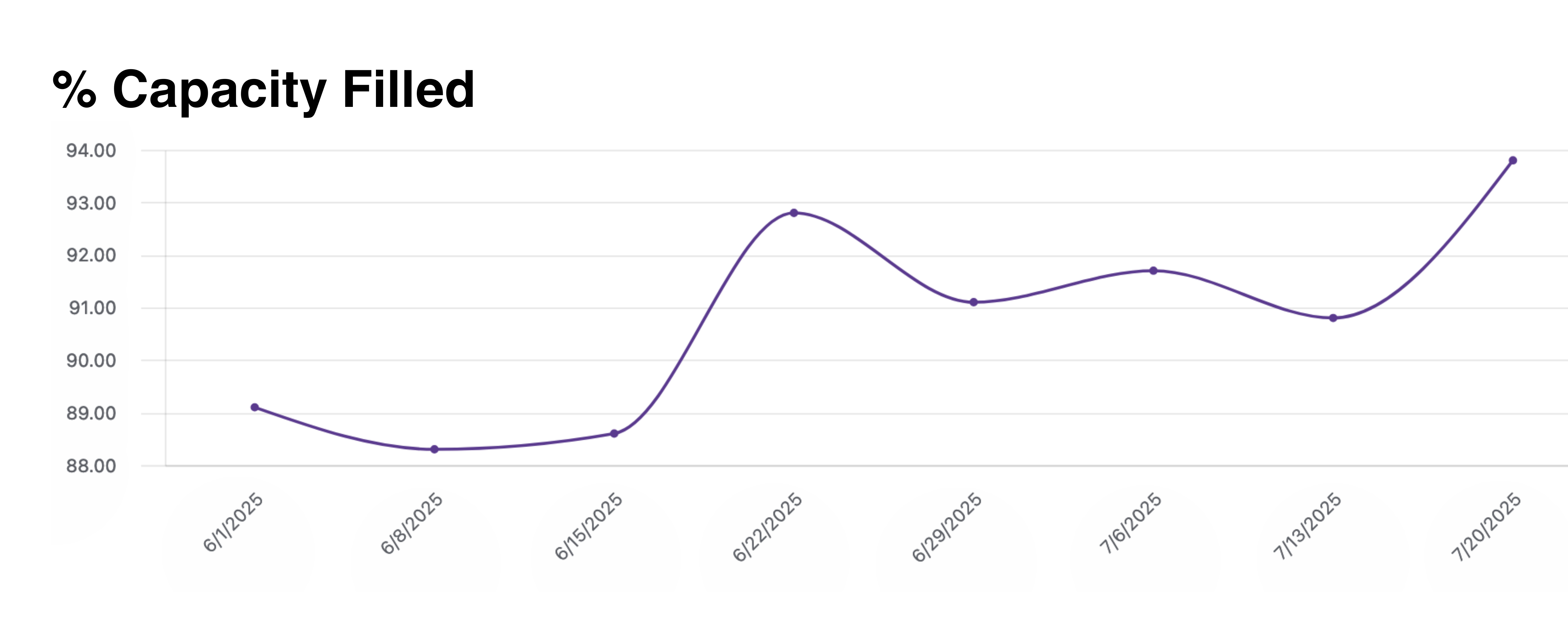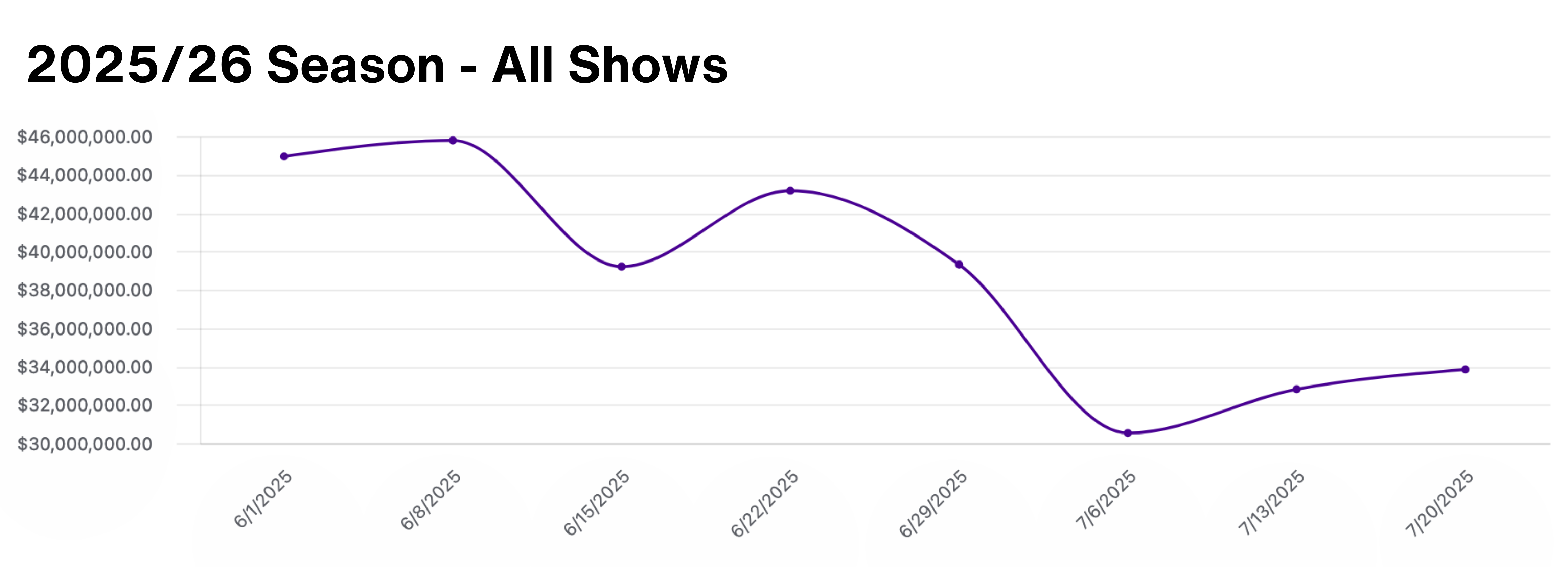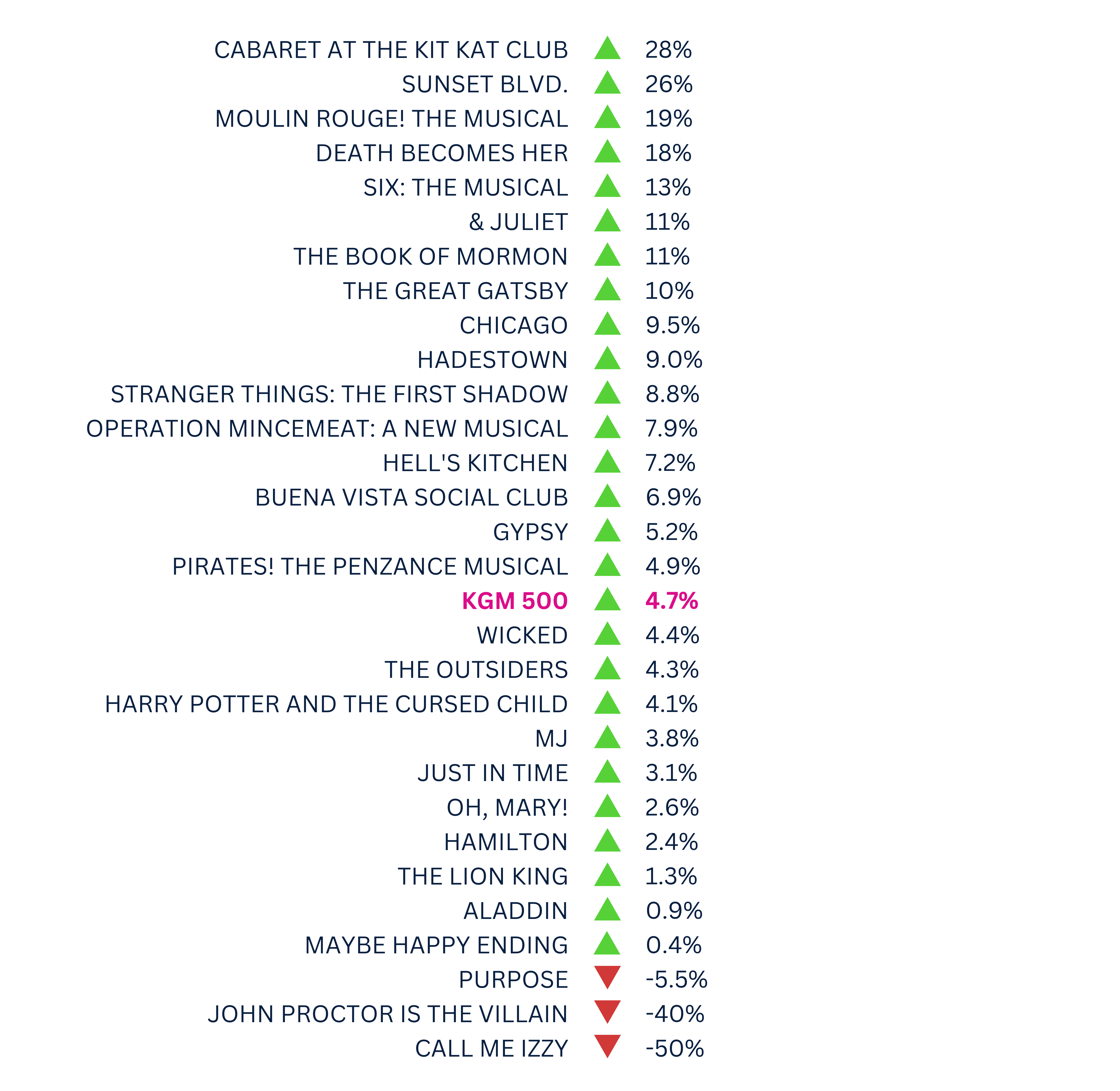 The KGM 500 is a Broadway market index used to track the overall health of the market based on the grosses of 5 long-running shows. This week, the KGM 500 rose to $7,843,446, a 4.7% increase from the previous week. Comparing this trend line to the total season’s grosses, we can see that the legacy shows are experiencing a boost that is stronger than the market average, likely due to the increased summer tourism. Below, you’ll find a metric to track each show’s performance in relation to the benchmark of the KGM 500.