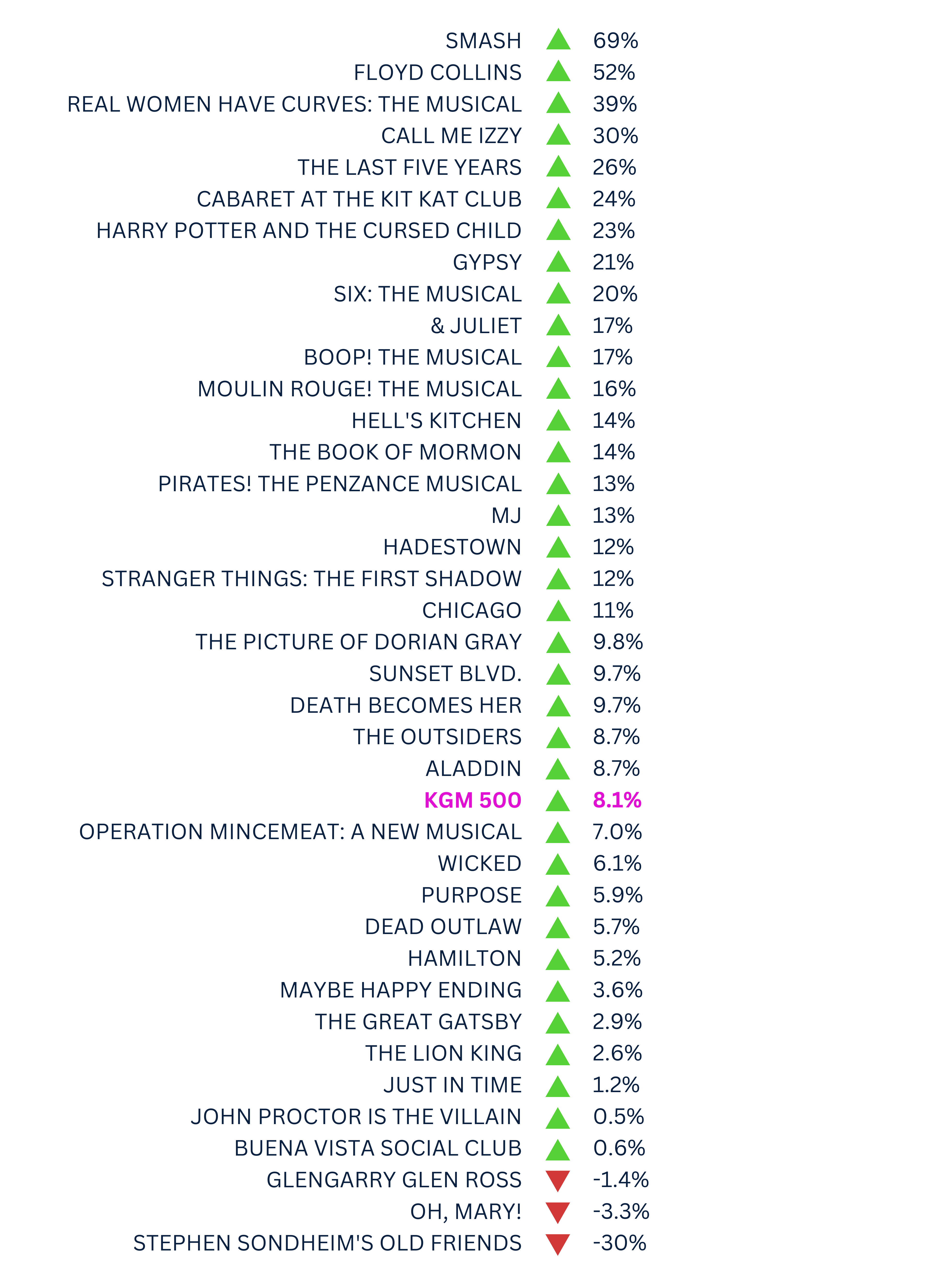 The KGM 500 is a Broadway market index used to track the overall health of the market based on the grosses of 5 long-running shows. This week, the KGM 500 jumped to $7,794,786, an 8.1% increase from the previous week. The rise in the KGM 500, coupled with an increase in the overall Broadway grosses, signals that the summer tourist season is officially upon us! A few shows, such as SMASH, Floyd Collins, and The Last Five Years also experienced a significant boost on their final week. Below, you’ll find a metric to track each show’s performance in relation to the benchmark of the KGM 500.