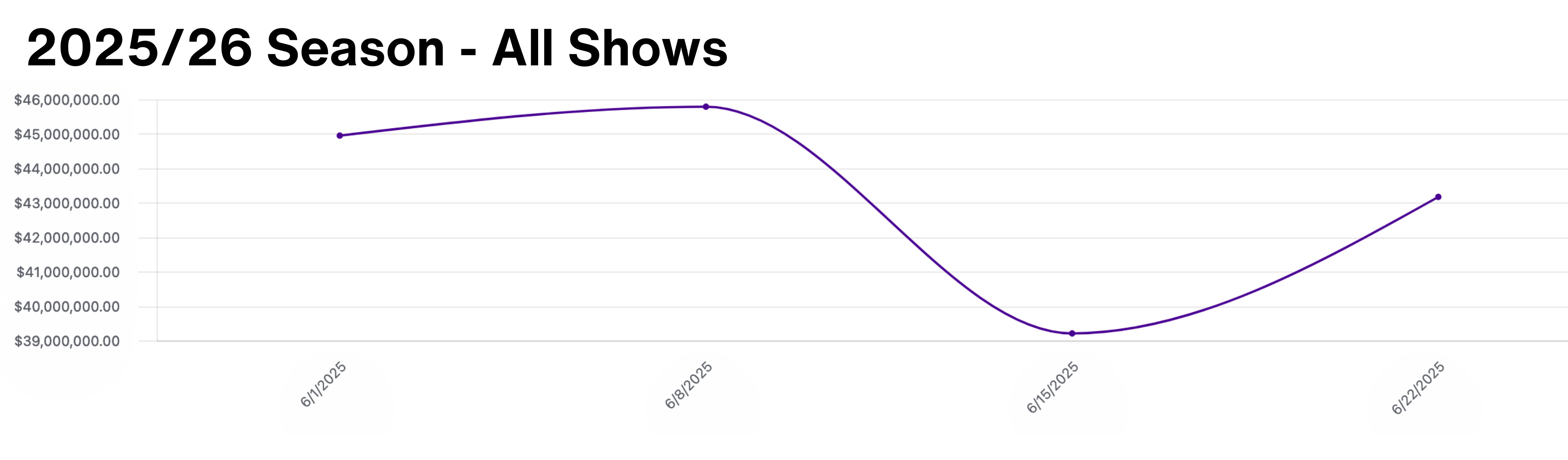 The Average Ticket Price graph shows the ATP for new plays that opened in the 2025/26 season. This week, ATP for new plays jumped to $130.67, a 29% increase from the previous week.