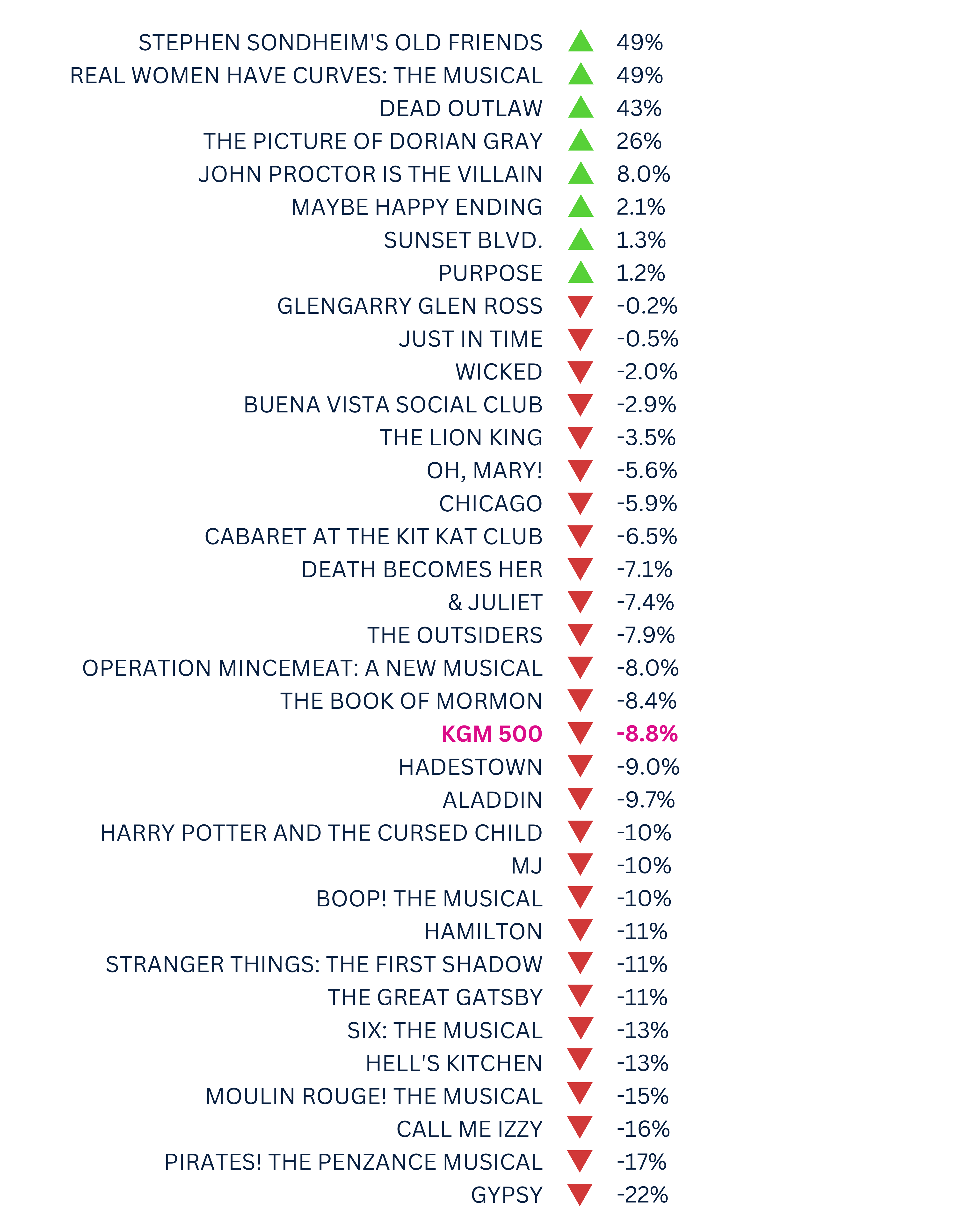 The KGM 500 is a Broadway market index used to track the overall health of the market based on the grosses of 5 long-running shows. This week, the KGM 500 dipped to $7,111,038, an 8.8% decrease from the previous week. The overall grosses sunk proportionally this week, with an 8.9% decrease. The closure of several shows, the annual post-Tony’s slump, and New Yorkers beginning to leave the city for the summer are all contributing factors to the dip in the overall grosses as we head into the holiday weekend. Below, you’ll find a metric to track each show’s performance in relation to the benchmark of the KGM 500.