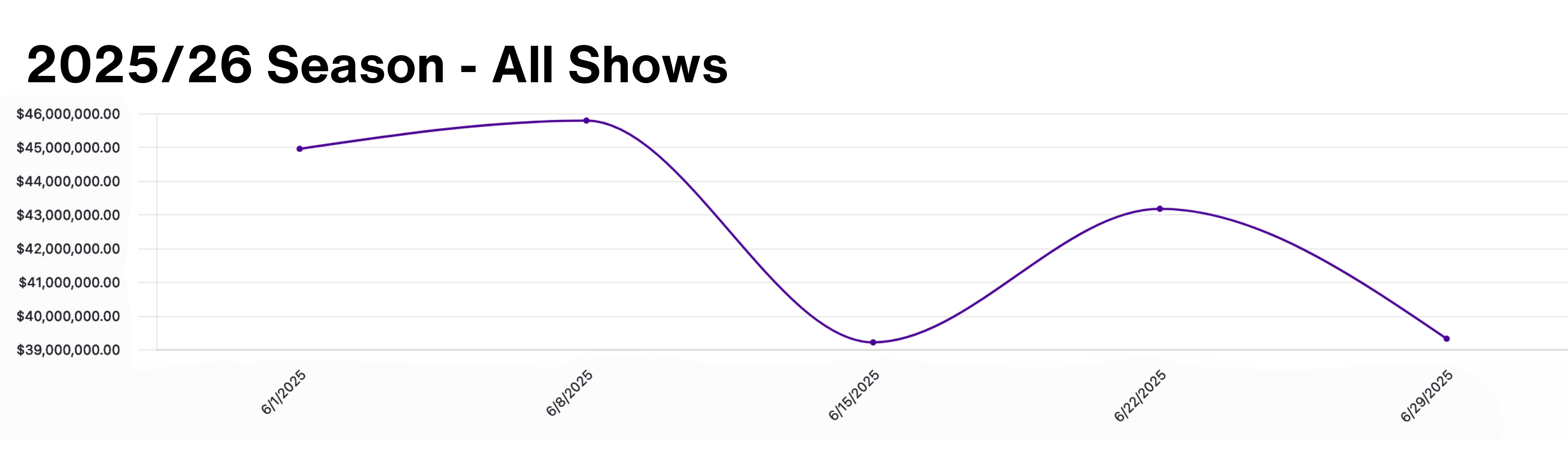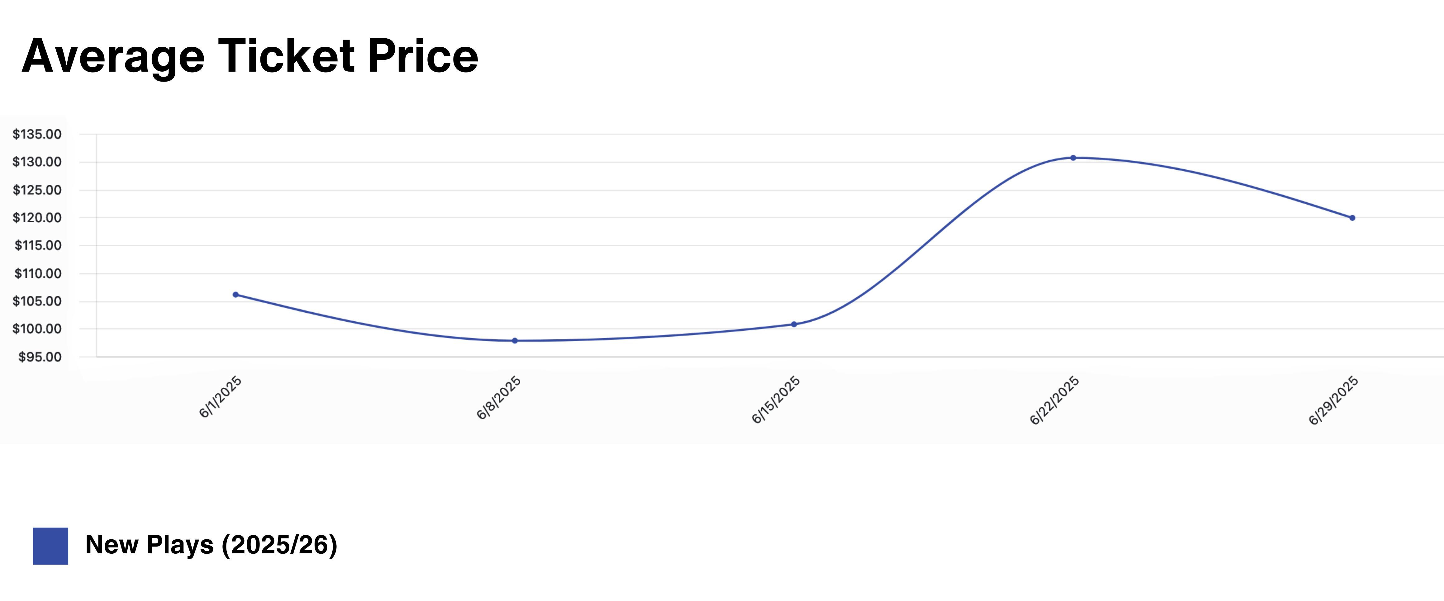 The Average Ticket Price graph shows the ATP for new plays that opened in the 2025/26 season. This week, ATP for new plays dipped slightly to $119.87, an 8.3% decrease from the previous week.