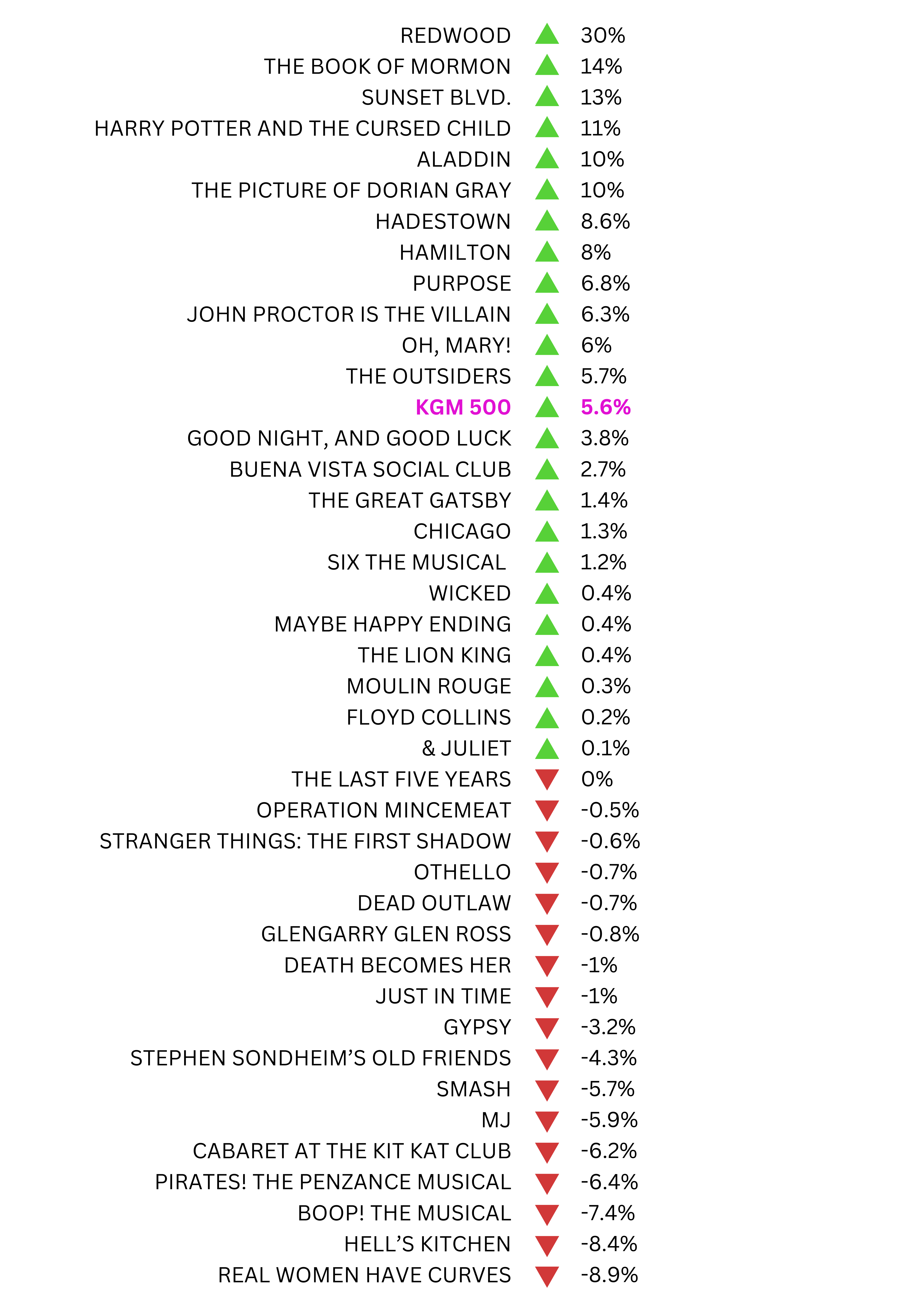 The KGM 500 is a Broadway market index used to track the overall health of the market based on the grosses of 5 long-running shows. This week, the KGM 500 rose to $6,735,156, a 5.6% increase from last week’s grosses. With 40 productions currently running on Broadway, the competition is steep, and new musicals that haven’t been Tony-nominated are in a particularly precarious spot. Below, you’ll find a metric to track each show’s performance in relation to the benchmark of the KGM 500.