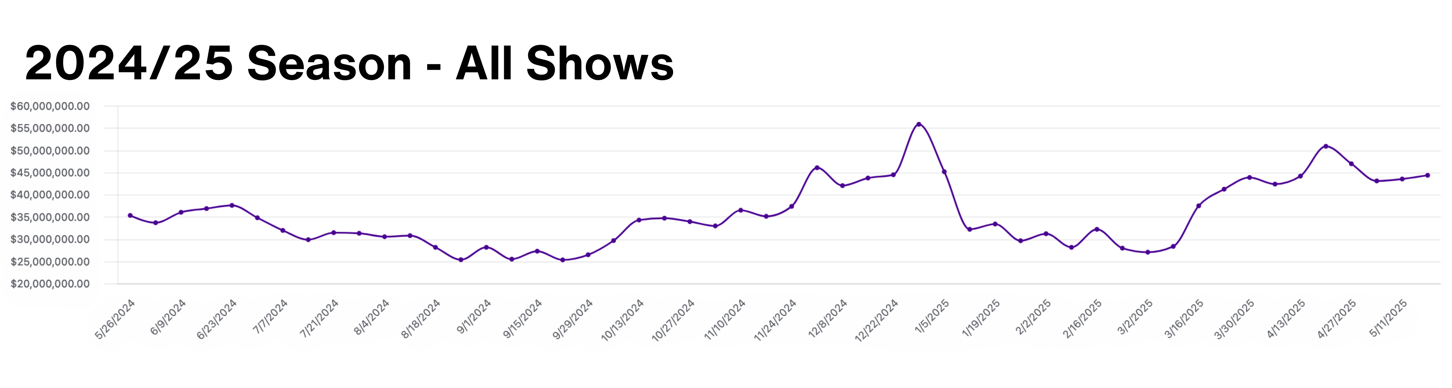 The Average Ticket Price graph shows a comparison of ATP for new musicals and plays that opened in the 2024/25 season. This week, ATP for new musicals remained at a modest $108.52, while ATP for new plays rose to $211.75. For the tenth week in a row, the new plays in the 24/25 season have out-grossed the new musicals.