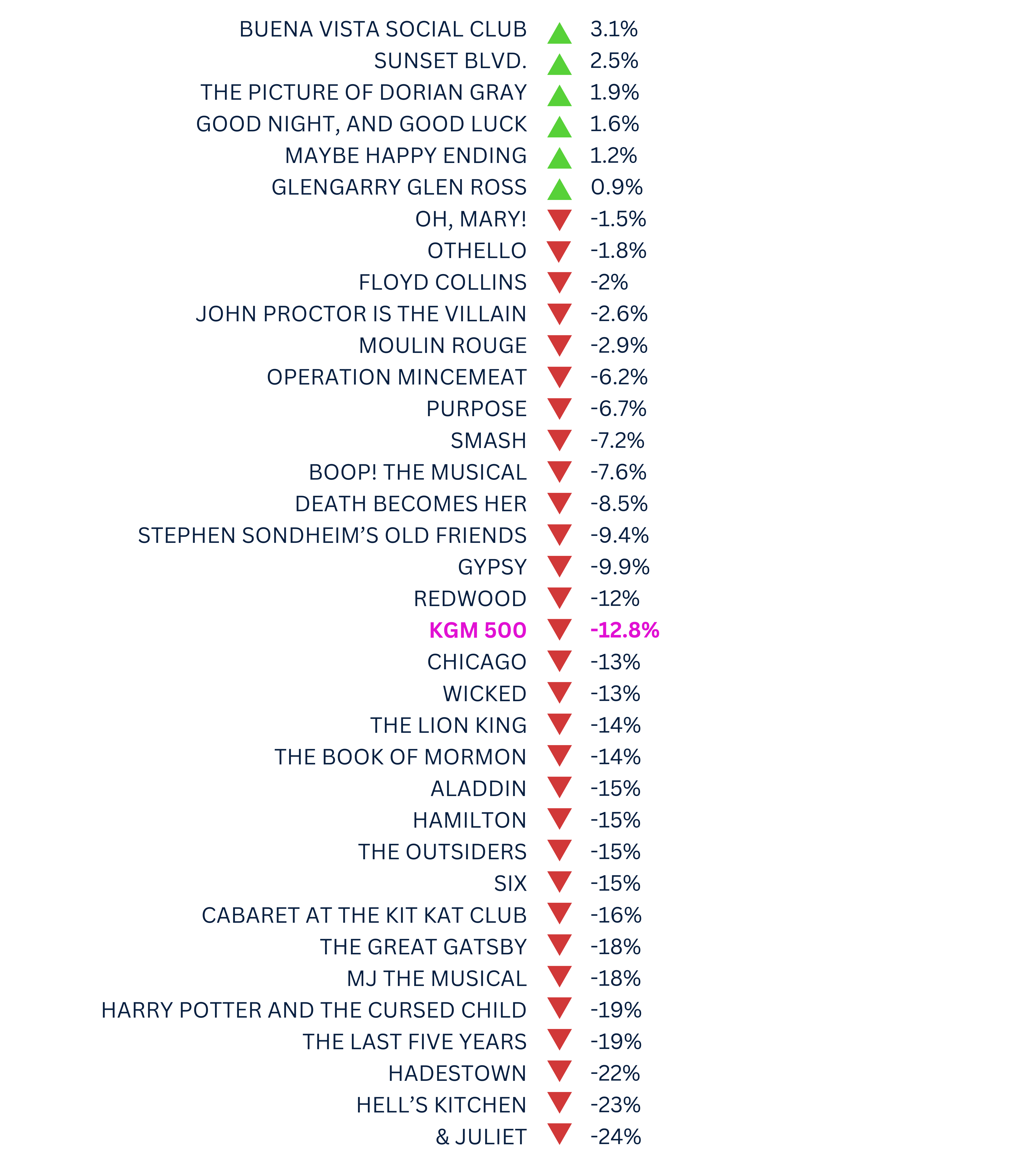 The KGM 500 is a Broadway market index used to track the overall health of the market based on the grosses of 5 long-running shows. This week, the KGM 500 dropped to $6,856,716, a 12.8% decrease from last week’s grosses. Following this week’s announcement of the Tony Award nominations, both long-running productions and those that received no nods experienced a more significant decline in grosses as compared to the newer, nominated shows. Below, you’ll find a metric to track each show’s performance in relation to the benchmark of the KGM 500.