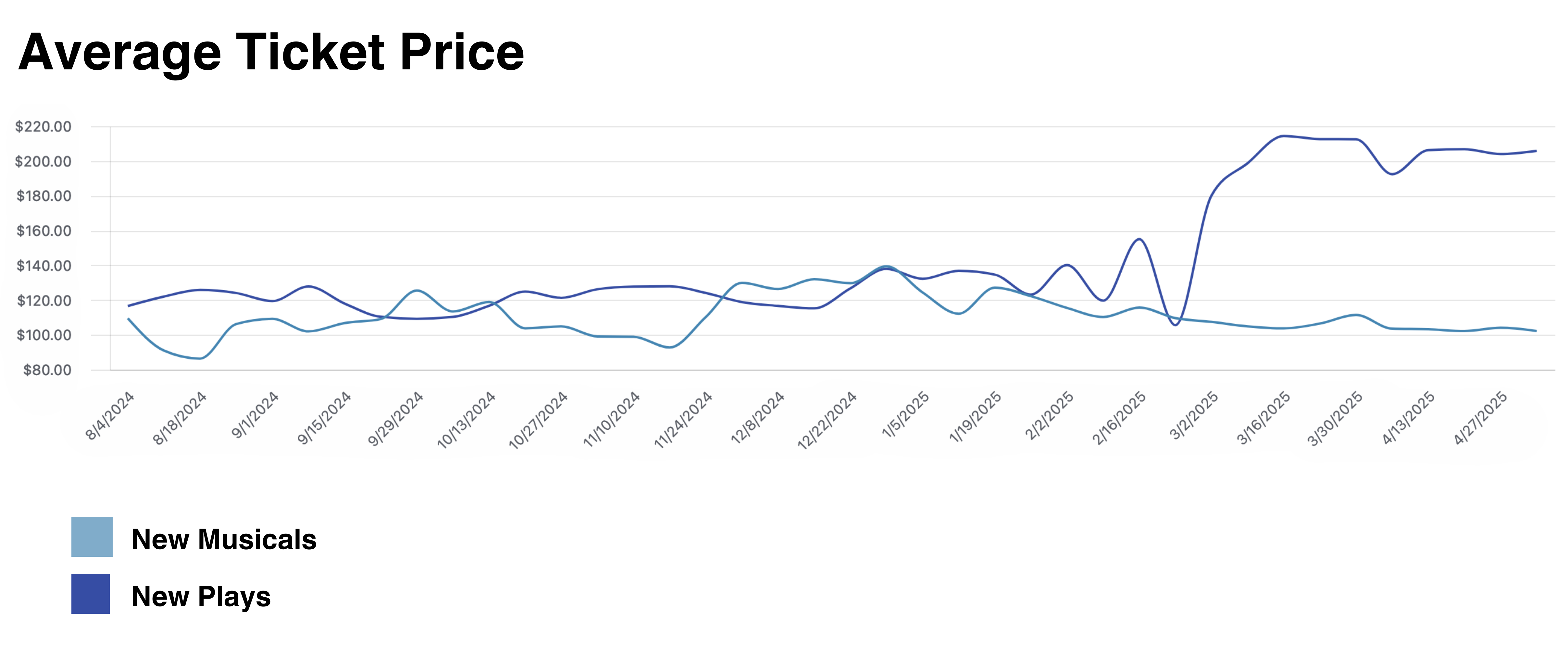 The Average Ticket Price graph shows a comparison of ATP for new musicals and plays that opened in the 2024/25 season. This week, ATP for new musicals remained steady at $102.18, while ATP for new plays came to $205.82. With audiences consistently paying double the price for new plays, the new plays in the 24/25 season have out-grossed the new musicals for the eighth week in a row.