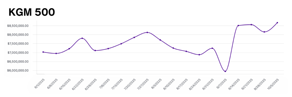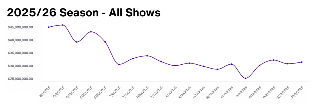 The KGM 500 is a Broadway market index used to track the overall health of the market based on the grosses of 5 long-running shows. This week, the KGM 500 rose to $8,667,299, a 6.3% increase from the previous week. The highest of the 25/26 season thus far, this marks an upturn in both grosses and attendance, as audiences return for the openings of the fall season. Below, you’ll find a metric to track each show’s performance in relation to the benchmark of the KGM 500.