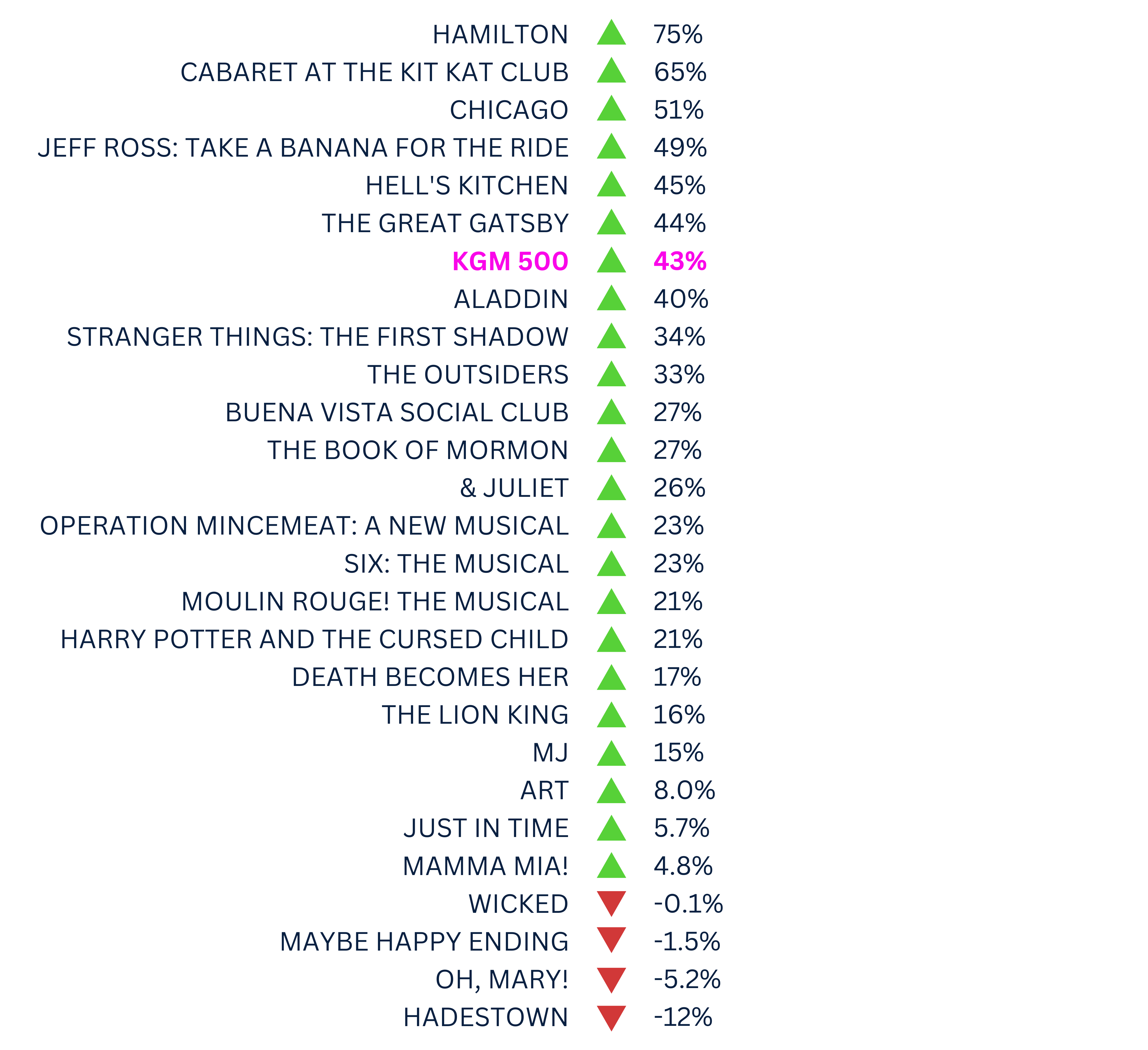 The KGM 500 is a Broadway market index used to track the overall health of the market based on the grosses of 5 long-running shows. This week, the KGM 500 soared to $8,506,133, a staggering 43% increase from the previous week. Many factors are contributing to the jump, the largest being Leslie Odom Jr’s return to Hamilton, as well as the Broadway Week 2-for-1 ticket offer, which began on September 8. Below, you’ll find a metric to track each show’s performance in relation to the benchmark of the KGM 500.