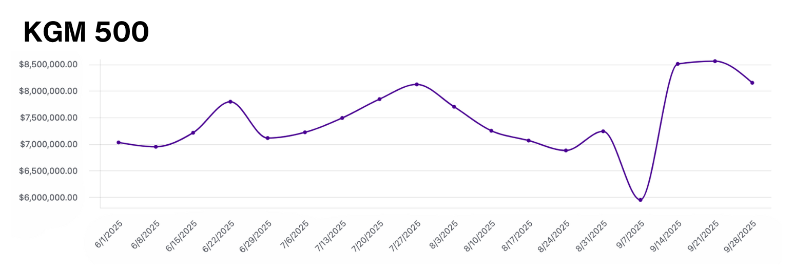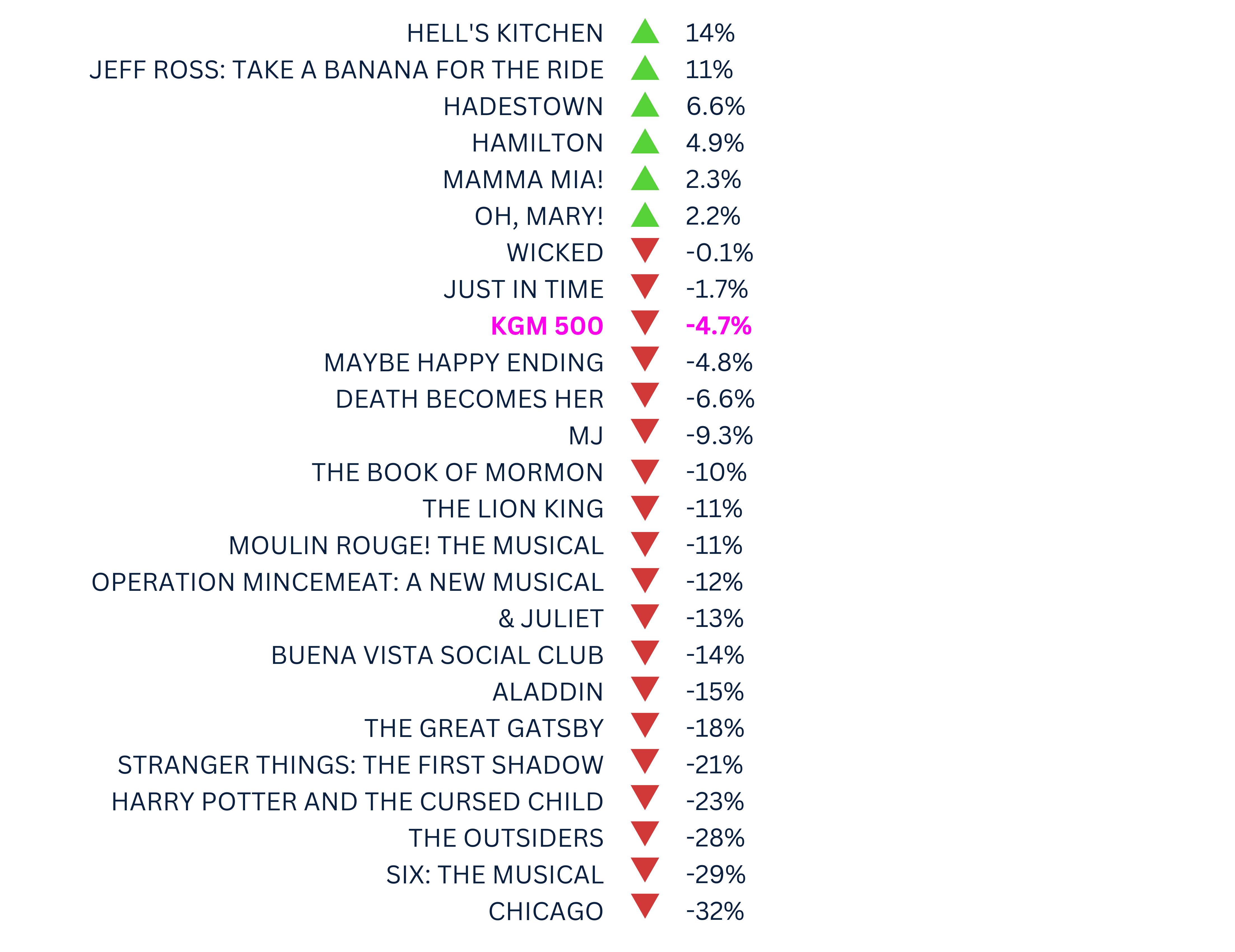 The KGM 500 is a Broadway market index used to track the overall health of the market based on the grosses of 5 long-running shows. This week, the KGM 500 dipped to $8,151,027, a 4.7% decrease from the previous week. Rosh Hashanah fell within this week, making attendance lower than usual, however the overall grosses remain strong, bringing in over $30M across the 28 shows. Below, you’ll find a metric to track each show’s performance in relation to the benchmark of the KGM 500.